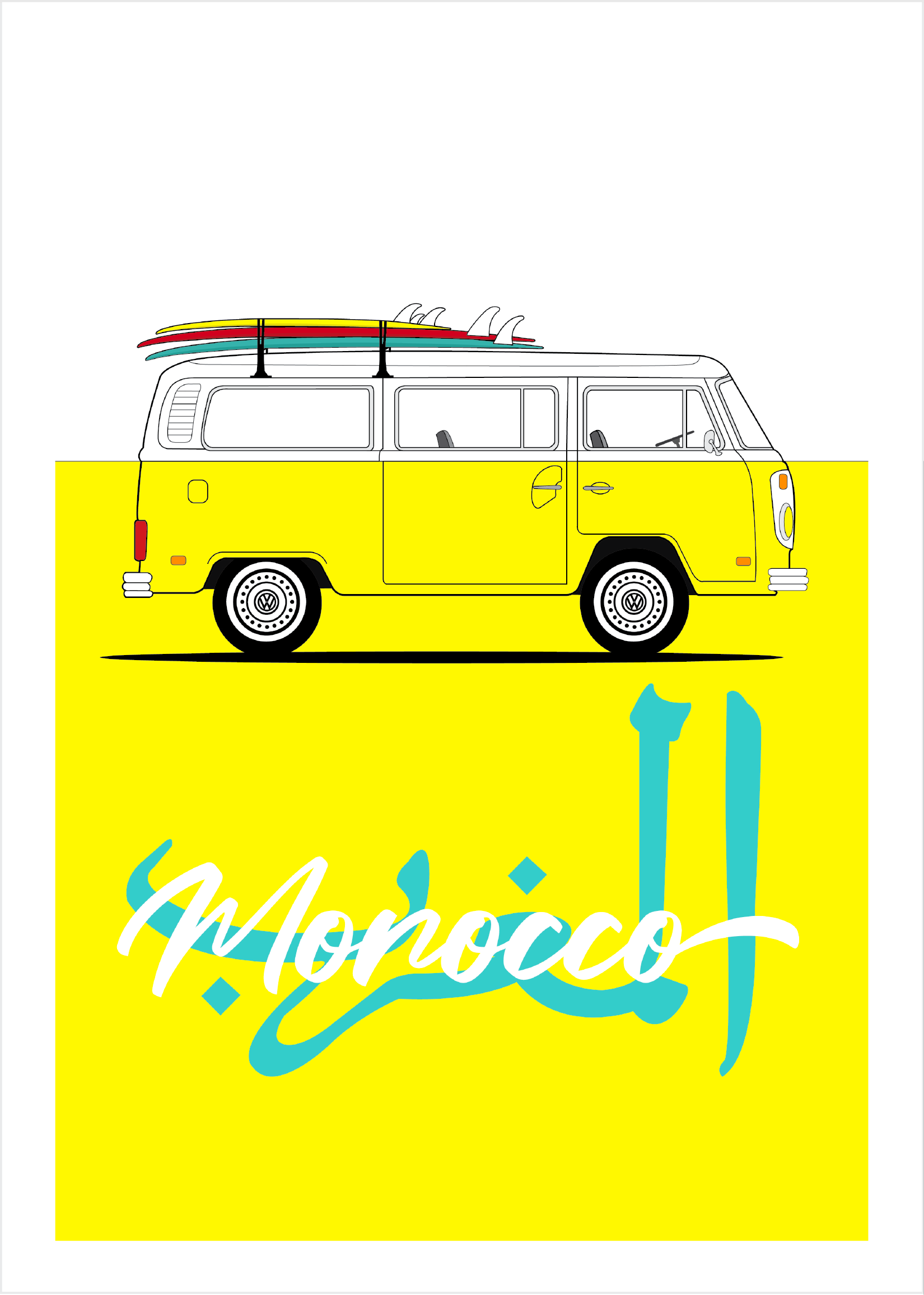 G.M continue a explorer les moyens de transport pour visiter le Maroc et nous propose cette fois-ci un hommage au mythique Transporter de Volkswagen. Cette forme un dytique déco « punchy » avec l’affiche « The legend 240 » // G.M continues to explore the means of transport to visit Morocco and this time offers us a tribute to the legendary Volkswagen Transporter. This forms a « punchy » decorative beetle with the poster « The legend 240 »